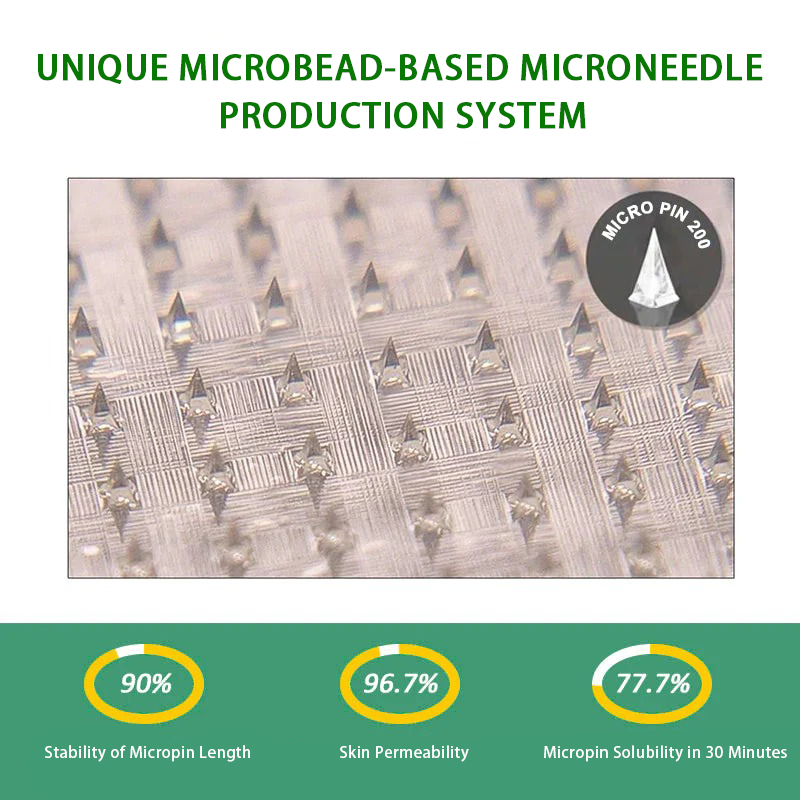 Each needle is 0.27mm long. just 1/7th the thickness of a hair. and is made from dissolvable medication. These micro-needles are precision-engineered using cutting-edge manufacturing techniques to ensure a seamless. pain-free experience while effectively delivering the active ingredients directly into the skin.